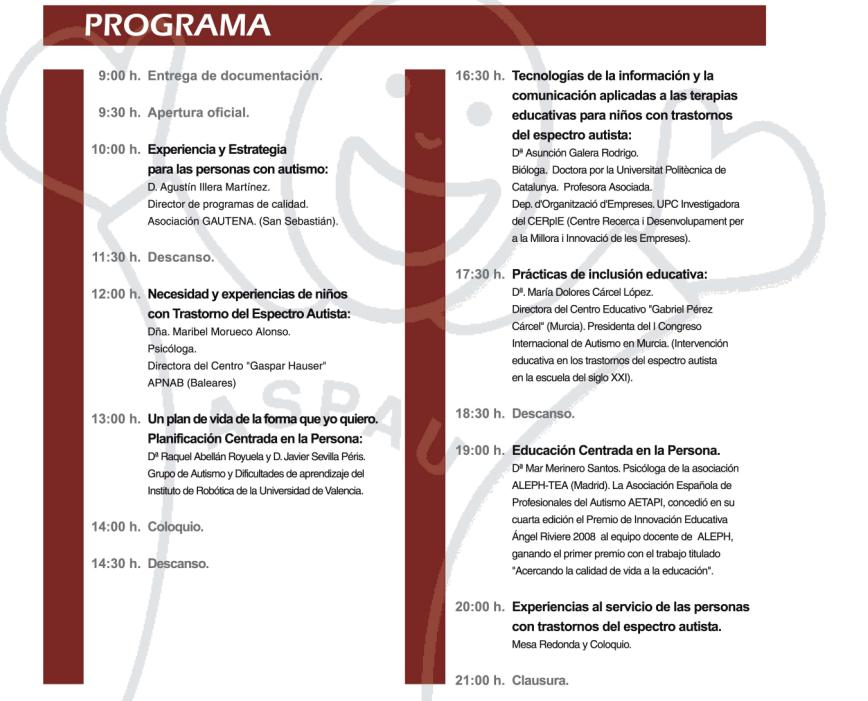ASPAU (Asociación Proyecto Autista) va a celebrar el próximo 23 de mayo una interesante jornada en Valencia, en el Centro Cultural Bancaja (Plaza Tetuán, 23), con un programa muy interesante y unos ponentes de verdadero lujo (Agustín Illera y Maribel Morueco entre otros).