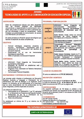 Esta semana estamos de suerte ya que vamos a celebrar unas jornadas en el CPR de Badajoz llamadas «Tecnologías de Apoyo a la Comunicación en Educación Especial» y vamos a contar con unos ponentes excepcionales que seguro van a dejarnos con ganas de saber más cuando terminen.