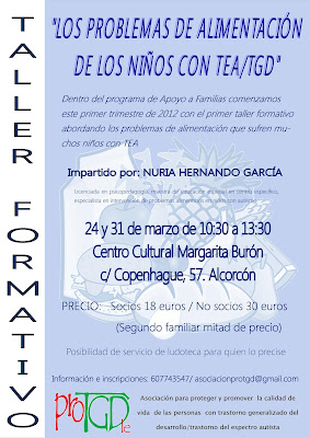 La asociación madrileña PRO_TGD, ha organizado para los días 24 y 31 de marzo, de 10:30 a 13:30 el taller «Los problemas de alimentación en los niños con TEA». Cómo sabéis es frecuente encontrar alteraciones en la alimentación que desde la ingesta selectiva de alimentos al consumo ritualizado, restricciones alimentarias, lentitud al comer o formación de bolos y otros muchos que requieren de un conocimiento preciso y una intervención específica para lograr una alimentación lo más normalizada posible y a la vez adecuada a la edad y las necesidades nutricionales.