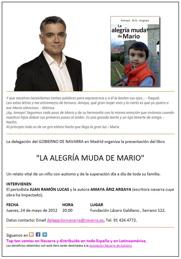 La primera de ellas es la presentación del libro «La Alegría Muda de Mario«, escrito por su madre Amaya Áriz Argaya. La presentación se realizará mañana jueves 24 de mayo en la Fundación Lázaro Galdiano (Serrano, 122) en Madrid, y todos los beneficios del libro se destinarán a la Asociación Navarra de Autismo.