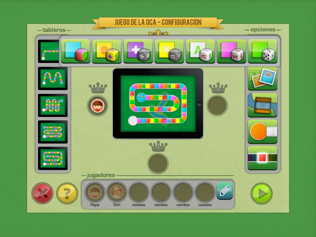 Una vez se ha entrado en el juego tenemos que definir los jugadores que se personalizan mediante un avatar. Podemos elegir entre los que vienen «de serie» que incluyen distintos personajes y animalitos, o elegir una foto del propio jugador. Los personajes se reparten alrededor del iPad que se convierte en tablero de juego y aquí aparece otra opción que sin duda resolverá más de un conflicto: la posibilidad de coronar a uno de los jugadores para «ayudarle un poquito» a ganar el juego.