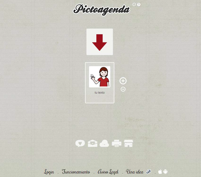 En la parte inferior de la pantalla encontramos otros enlaces. El primero de ellos sirve para hacer login y acceder a la zona de usuario. La primera vez que pulsemos nos pedirá crear una cuenta con un correo electrónico, nombre de usuario y contraseña. Las siguientes veces solo habrá que meter esos datos para acceder a nuestra agenda personalizada. Es importante saber que este usuario no sólo sirve para la Pictoagenda sino también para el Pictotraductor, otra aplicación del mismo grupo que sirve para hacer frases con pictogramas.