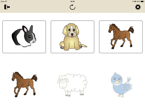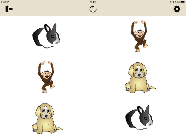 - Busca los iguales: Ofrece un número de elementos que oscila entre 4 y 12 y pueden ser palabras o dibujos, entre las cuales existen dos elementos iguales que el niño ha de emparejar.