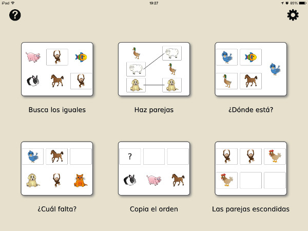 Empareja y Encuentra nos ofrece 6 tipos de actividades diferentes y, cada uno de ellos, como viene siendo habitual en las aplicaciones desarrolladas por Special iApps, tiene distintos niveles de personalización, además de las opciones generales que permiten definir los aspectos visuales (colores, fondos…) y sonoros (refuerzos, interacción con los elementos…) además de incluir la posibilidad de utilizar pulsadores para su uso, acercándolo de este modo también a personas que tengan dificultades para el manejo físico de un táblet o iPad.