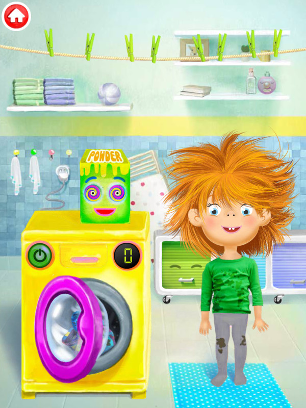 Una vez seleccionado nuestro pequeño protagonista, solo queda elegir qué actividad vamos a desarrollar con él. La versión gratuita ofrece el lavado de la ropa y el aseo en el lavabo. La versión completa (1,79 € para dispositivos Apple y 1, 59 € para dispositivos Android) ofrece además el uso del WC y de la bañera.