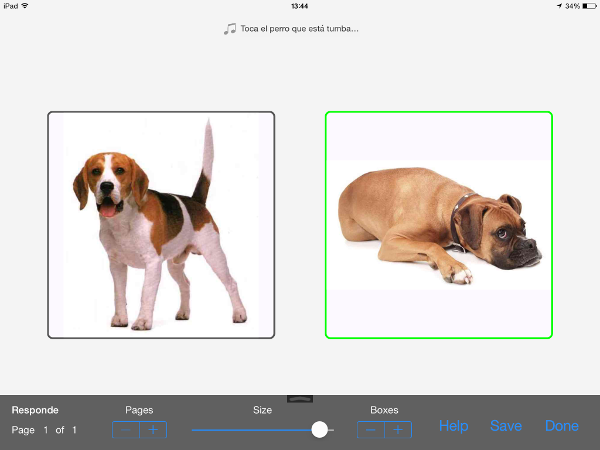 - Actividades de aprendizaje de conceptos. Creando un tablero con dos imágenes, lanzamos una pregunta para que la persona señale la respuesta correcta. En esta ocasión solo se ha marcado como «respuesta correcta» una de las opciones, sin asociar sonido, de forma que, al pulsar sobre ella, se muestra a pantalla completa acompañada de un aplauso. Si se pulsa sobre la respuesta incorrecta, simplemente no sucede nada.